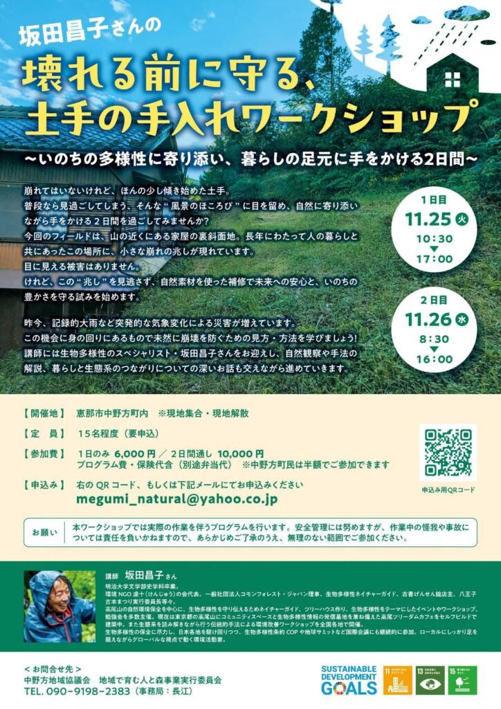 今年も恵那市の中野方町で生物多様性のスペシャリストとして全国各地で精力的に活動を続けていらっしゃる坂田昌子さんをお呼びしてワークショップを開催します!